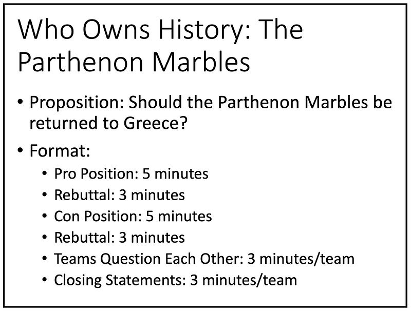 Another hallmark of my teaching is the emphasis on critical, reflective engagement with complex issues surrounding the interpretation of ancient art and the ethical questions that arise in the study of cultural heritage. One example is an in-class debate on the Parthenon Marbles, where students are divided into teams to argue whether the sculptures should remain in the British Museum or be returned to Athens. This assignment challenges students to consider the broader implications of repatriation, cultural identity, and the politics of museum collections, while also honing their research, public speaking, and argumentation skills.