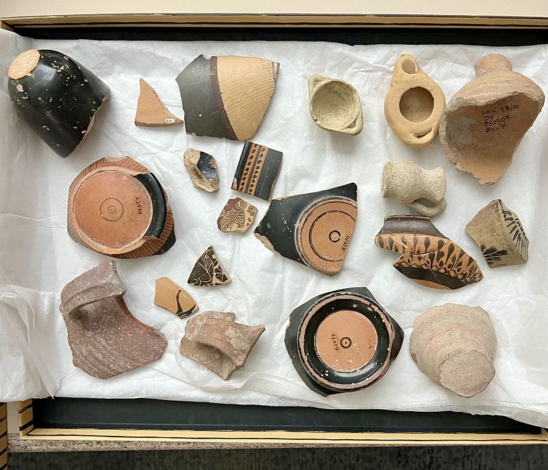 One key aspect of my teaching is the integration of physical artifacts and real-world experiences. To help students better understand the material record discussed in lectures, I bring sample artifacts into the classroom whenever possible. This allows students to gain instruction in best practices for object handling, learn how to examine artifacts in person, and engage with ancient materials on a sensory level. For example, in a course on Greek pottery, students investigate fragments of ancient vases, learning to differentiate between wheel-made and hand-thrown pottery, identifying the specific parts of the vessel the fragments correspond to, and analyzing surface decoration techniques. These hands-on activities enable students to engage in the same methods used by archaeologists to interpret ancient objects.